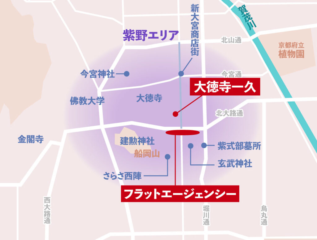 京都市中心部から外れた北部、大徳寺のお膝元のエリアを「紫野(むらさきの)」と呼びます。左大文字と賀茂川にはさまれ、今宮神社や船岡山があり、閑静で歴史の深さが感じられるエリアです。銭湯が多いという意外な特色もあるんですよ。