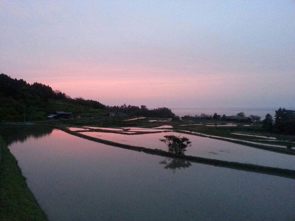この写真、絶景ですね!海と田んぼがすぐ近くに!
