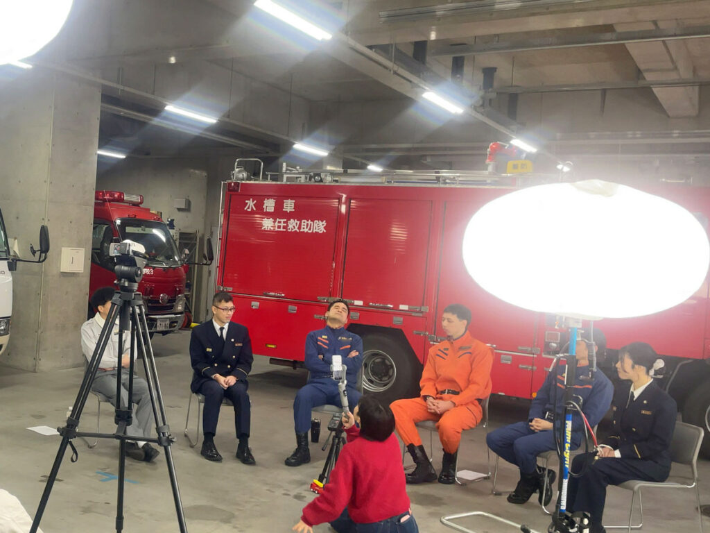 現場に着いてまず驚いたのが、皆さんとっても親切なことでした!! カメラの準備を始めようとしたら、あちらこちらから局員さんが集まってきて、コードリールを出してくれたり、大きいライトを点けてくれたり、椅子をてきぱきと運んでくれたり、車を移動させてくれたり…。その気持ちがありがたかったことはもちろん、とっても手際が良いんです!!よく考えたらそうですよね。消防の現場でマゴマゴしていたら大変なことになりますものね。座談会の本番前の時点で「消防士という存在」を肌で感じる貴重な経験になりました。