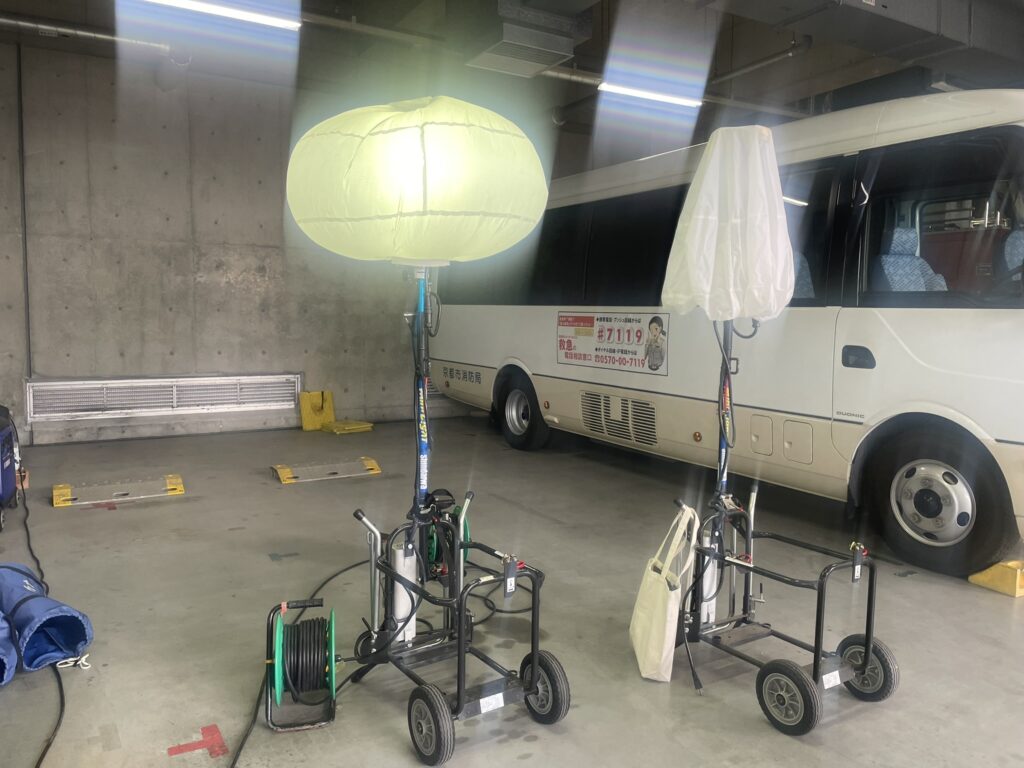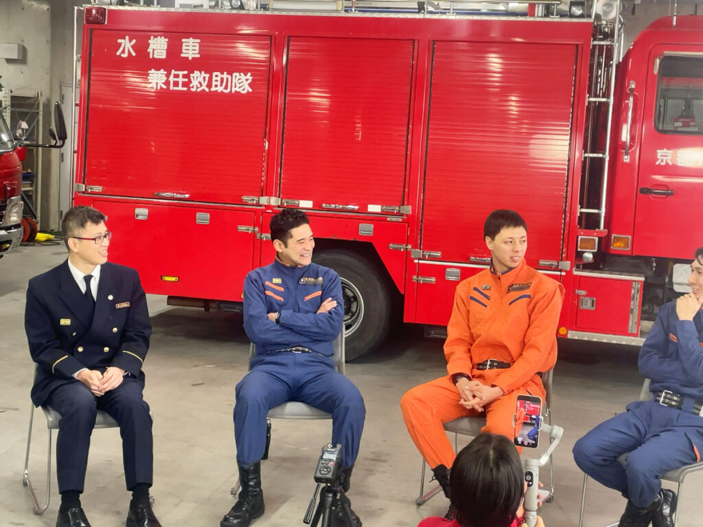「皆さんのありのままの姿や想いを伝えるため、座談会をしましょう!」と提案したところ、「よしきた!!」と京都市消防局の皆さんが二つ返事でご承諾いただき、さっそく上鳥羽にある京都市消防学校の車庫で座談会を行いました。